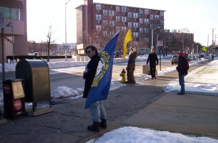 EPRCIFIJA WookieeDave Ridley in a Wookiee costume, along with other activists, handing out FIJA flyers in front of the Hillsborough Superior Court in Manchester, New Hampshire. | |