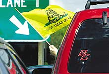 EPRCIGadsden flag at tollboothA man waves a Gadsden flag from his car at a “penny protest” at a tollbooth in Merrimack, New Hampshire. | |